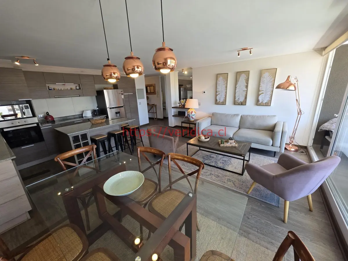Vendo propiedad en plan de Viña del Mar, 2 norte, en barrio poniente. Este departamento destaca por su superficie total de 128 m² y útil de 105 m², ofreciendo un espacio funcional distribuido de la siguiente forma: un amplio hall de acceso, sal de estar, living comedor con cocina integrada, terraza que rodea todo el departamento, tres dormitorios cada uno con salida a su terraza, tres baños (2 completos más el de visita principal en suite). La cocina está amoblada y equipada, cuenta con una isla central, ideal para reuniones y actividades cotidianas. El departamento incluye 3 estacionamientos, 1 bodega de 2 metros por 1,70 metros.