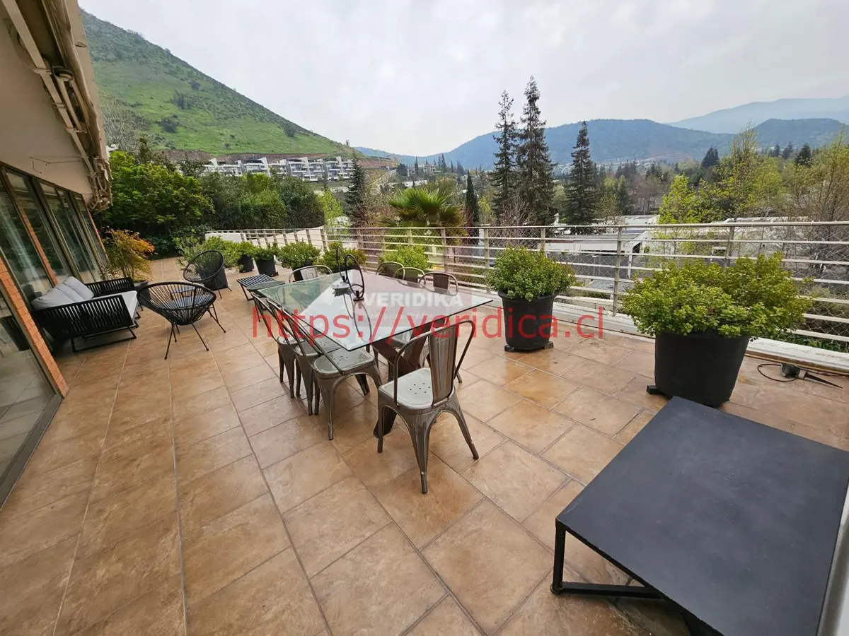 Veridika vende departamento tipo casa, la propiedad cuenta con 486 m2 totales, de los cuales 236 m2 son útiles, tiene orientación y una hermosa vista norte al valle y cordillera.La propiedad tiene terraza con toldo retractil, patio y piscina privados del departamento